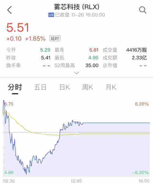 上述消息發布后,中概股霧芯科技(旗下悅刻品牌系中國第一電子煙品牌)盤前一度跌近20%,但開盤后漲超6%,隨后又跌超8%,最后收漲1.85%,股價如坐“過山車”。