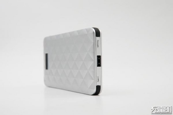 移動電源正面非常的簡潔,類膚材質,菱格浮雕的紋路,用手摸起來非常的有質感,靠下部分有一塊多功能LCD的顯示屏??梢詫崟r查看到輸出或輸入的電壓電流以及剩余電量情況,數據直觀、非常方便。