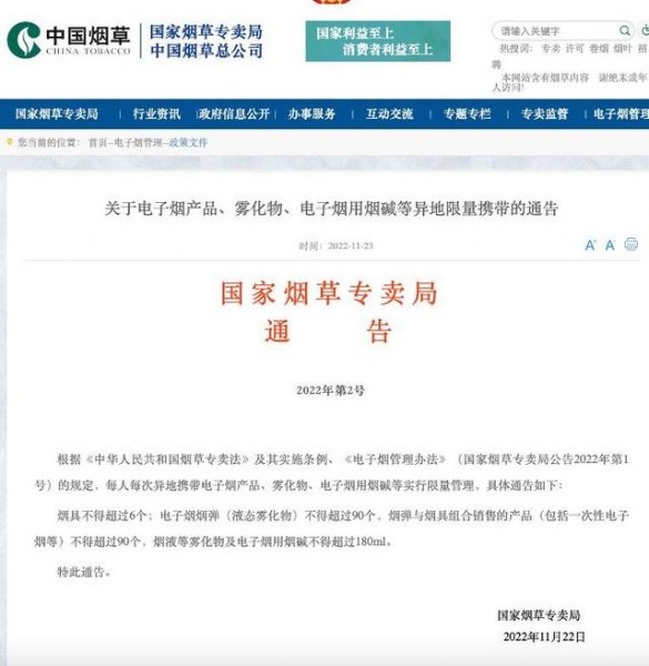 根據《中華人民共和國煙草專賣法》及其實施條例、《電子煙管理辦法》(國家煙草專賣局公告2022年第1號)的規定,每人每次異地攜帶電子煙產品、霧化物、電子煙用煙堿等實行限量管理,具體通告如下:
