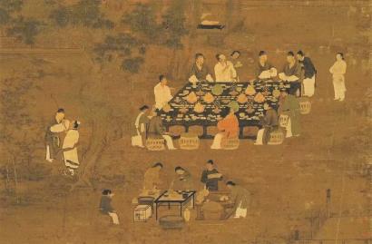 唐代詩人錢起有一首《與趙莒茶宴》詩:“竹下忘言對紫茶,全勝羽客醉流霞。塵心洗盡興難盡,一樹蟬聲片影斜?!彼^“茶宴”,是以茶代酒來宴請賓客。從“竹下忘言”、“一樹蟬聲”兩句來看,趙莒的茶宴舉辦,大概在盛夏的茂林修竹之中。其中,宴會上品的紫茶,在唐代飲茶風尚中被視為上品,陸羽在《茶經》卷上也曾言,茶以“紫者上”,而“綠者次”。清風徐來、樹影婆娑,三五好友寤坐清談,比之于“竹林七賢”的痛飲狂嘯,更是另一番風味,魏晉文人通過吃藥喝酒入迷狂,唐宋之士則以品茗之清雅為尚。