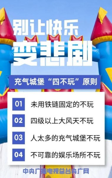 此外,在小孩玩充氣城堡時,一定要有家長的看護并仔細閱讀游玩須知,萬一發生意外,千萬別驚慌!冷靜尋找逃生方法并在保障安全的前提下保留一些現場資料,如視頻、音頻、照片等,以便日后維權使用。
