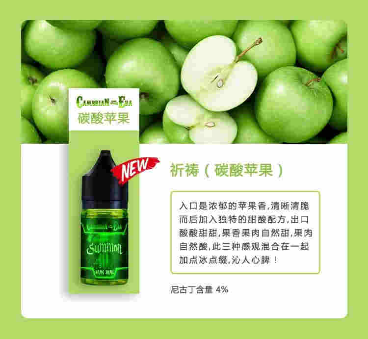 入口是濃郁的蘋果香,清晰清脆而后加入獨特的甜酸配方,出口酸酸甜甜,果香果肉自然甜,果肉自然酸,此三種感觀混合在一起加點冰點綴,沁人心脾!尼古丁含量4%