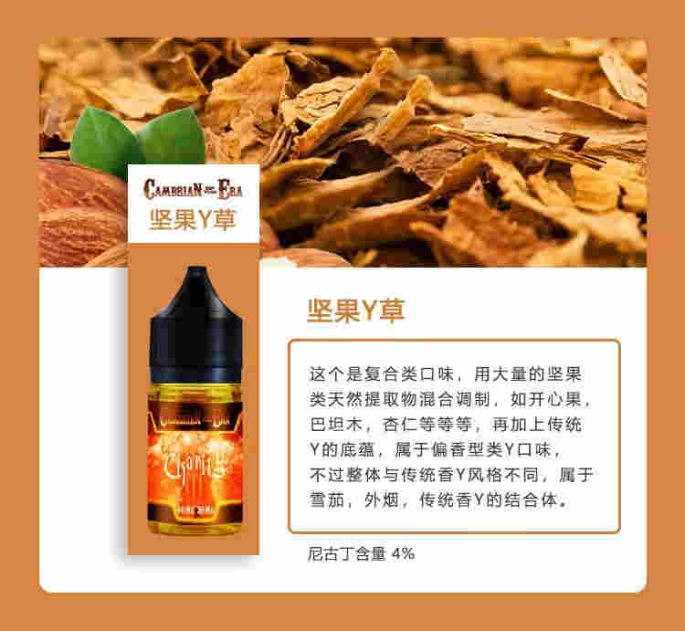 這個是復合類口味,用大量的堅果類天然提取物混合調制,如開心果,巴坦木,杏仁等等等,再加上傳統Y的底蘊,屬于偏香型類Y口味,不過整體與傳統香Y風格不同,屬于雪茄,外煙,傳統香Y的結合體。尼古丁含量4%