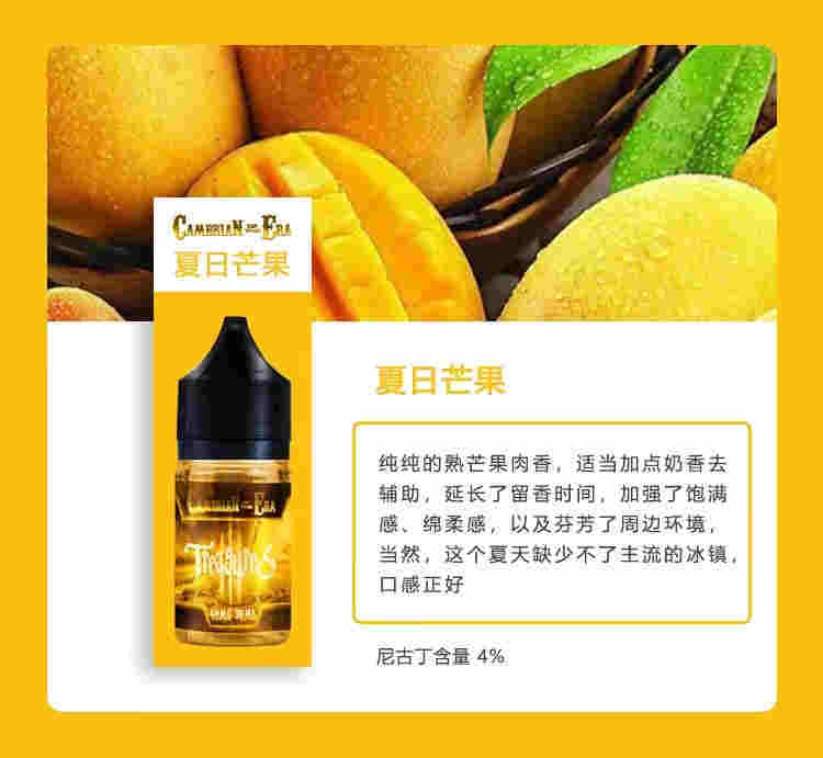 對比市場其他綠豆冰來說,我們這個綠豆香整體表現得更加強,并且層次豆肉香,尾部是綠豆沙感,用寒武紀官方彈體驗感更上一層尼古丁含量4%夏日芒果純純的熟芒果肉香,適當加點奶香去輔助,延長了留香時間,加強了飽滿感、綿柔感,以及芬芳了周邊環境,當然,這個夏天缺少不了主流的冰鎮,口感正好尼古丁含量4%