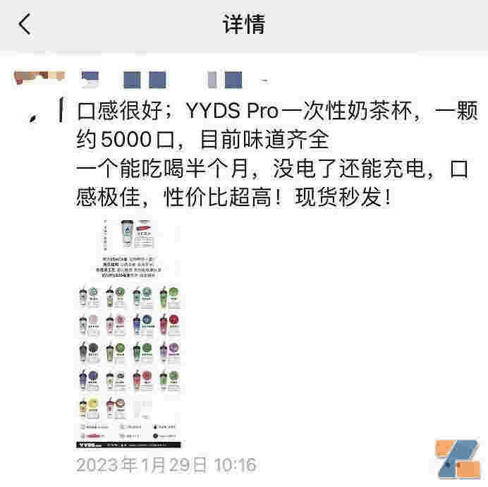 一次性奶茶杯電子煙,就是其中最受歡迎的產品。在線下門店,仍有店主暗中售賣奶茶杯;在線上微商等渠道,奶茶杯也是熱門產品,朋友圈中充斥著不少海報。微博上,“奶茶杯”超話主頁已有1389.4萬閱讀,5300篇帖子,絕大部分內容是在線求購和微商廣告。