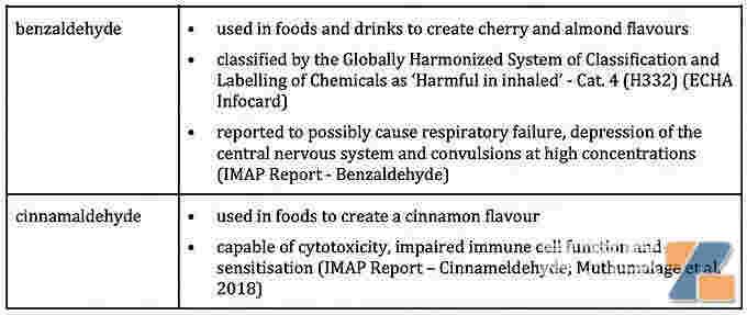 在澳大利亞電子煙標準TG110中,肉桂醛和苯甲醛被明確列為禁用物質。該標準還寫明,肉桂醛與苯甲醛分別被歐洲化學品管理局(ECHA)和美國食品藥品監督管理局(FDA)報告為有害物質,肉桂醛在高濃度時攝入可能引起呼吸衰竭、中樞神經系統抑制和驚厥;苯甲醛則具有細胞毒性,可導致免疫細胞功能受損和致敏作用。