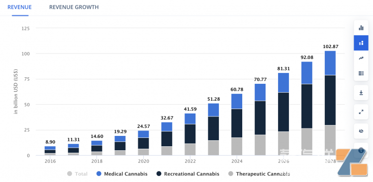 據數據統計網站Statista的預測,預計 2023 年大麻市場收入將達到 512.7 億美元,2023-2028年復合年增長率為14.95%,到2028年市場規模將達到1029億美元。
