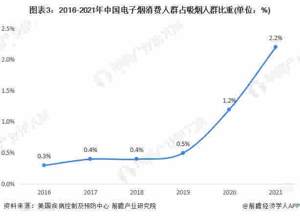 根據美國疾病控制及預防中心的數據,中國煙民中電子煙使用者的滲透率在2020年起快速上升,2021年末預計達到2.2%左右。