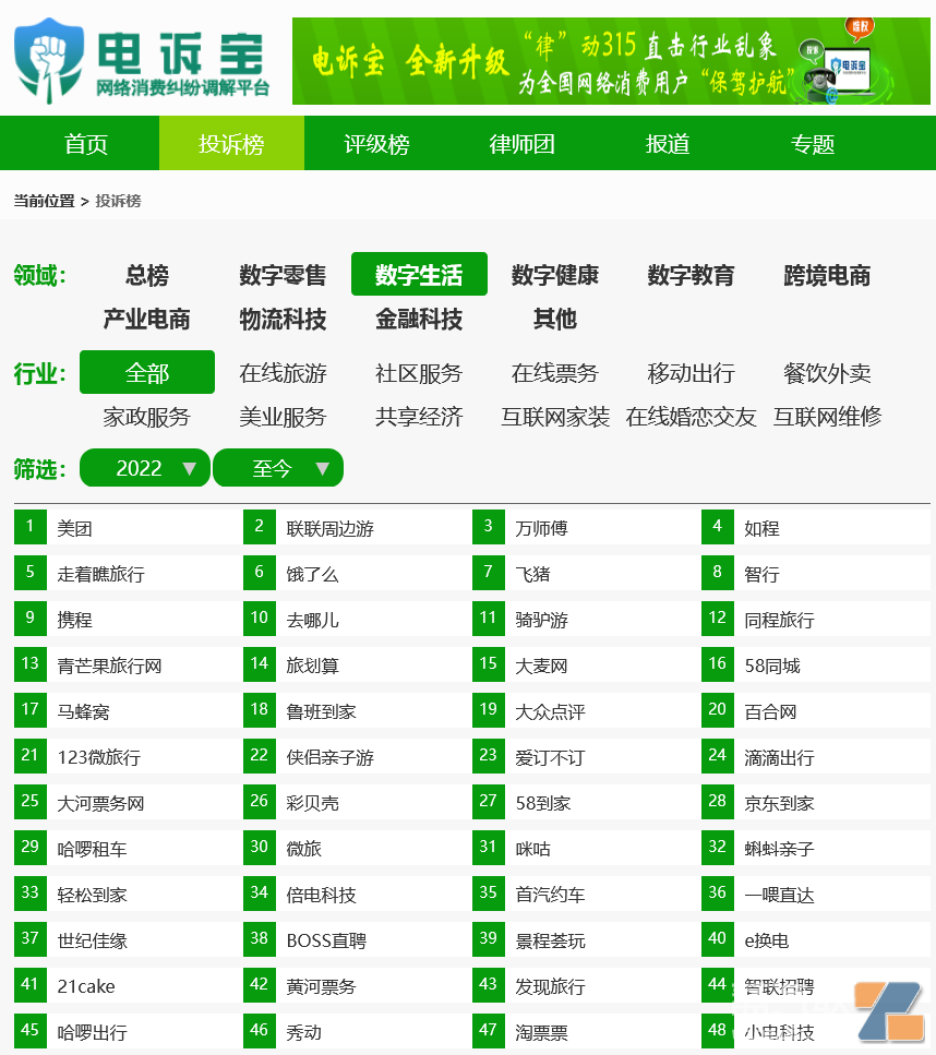 據國內知名網絡消費糾紛調解平臺“電訴寶”(315.100EC.CN)顯示,2022年至今數字生活領域的投訴事件按投訴量排名依次為、美團、聯聯周邊游、萬師傅、如程、走著瞧旅行、餓了么、飛豬、智行、攜程、去哪兒、騎驢游、同程旅行、青芒果旅行網、旅劃算、大麥網、58同城、馬蜂窩、魯班到家、大眾點評、百合網、123微旅行、俠侶親子游、愛訂不訂、滴滴出行、大河票務網、彩貝殼、58到家、京東到家、哈啰租車、微旅、咪咕、蝌蚪親子、輕松到家、倍電科技、首汽約車、一喂直達、世紀佳緣、BOSS直聘、景程薈玩、e換電、21cake、黃河票務、發現旅行、智聯招聘、哈啰出行、秀動、淘票票、小電科技。