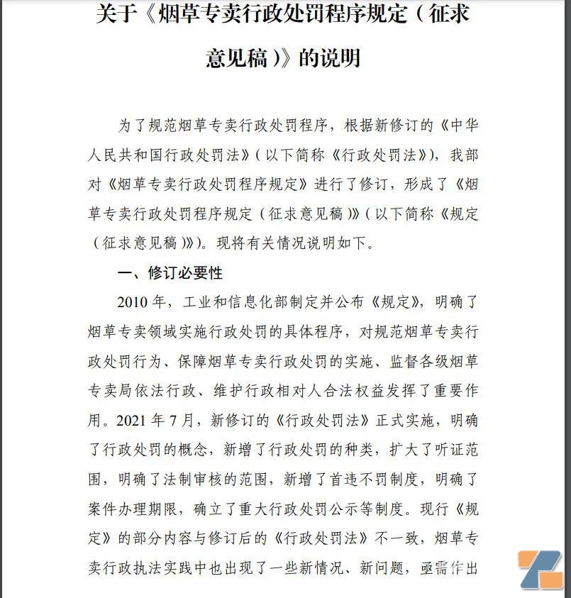 (電子煙處罰意見稿來了) 有什么亮點呢? 一、12月將有新的執法依據。 按照這份稿件提及,請于2022年12月5日前反饋意見。說明12月意見征求截止。 既然是征求意見,當然各位有意見可以先提。 這次也明確提到,修改法的必要性。特別提到,煙草專賣行政執法實踐中也出現了一些新情況、新問題,亟需作出相應調整和補充,增強行政處罰的規范性和可操作性。 而且還特別提到“最新修訂內容,明確電子煙等新型煙草適用本規定?!?/span> (適合電子煙) 二、首例不罰的原則,而且不得重復罰。 規定提到,增加“沒收違法所得”的適用規定,并明確“違法所得”的范圍;補充同一個違法行為不得重復處罰、從輕或者減輕行政處罰情形、首違不罰、行政裁量基準等規定。 (增加了修改) 三、什么情況可以拒絕檢查和處罰? 規定提到,處罰要出示證件。 規定提到,執法人員不出示執法證件的,當事人或者有關人員有權拒絕接受調查或者檢查。就是被查的時候,當事人或者有關人員有權要求執法人員出示執法證件。 增加執法人員不出示執法證件當事人有權拒絕接受調查、當事人配合義務等規定。 四、要協助函。 規定提到,協助函很重要,特別要查合同之類的。提到“執法人員需要從有關單位查閱、復制與違法活動有關的合同、發票、賬冊、單據、記錄、文件、業務函電和其他材料的,應當出示縣級以上煙草專賣局出具的協助函?!?/span> 而且明確“未經法制審核不得作出行政處罰決定、法制審核人員應當取得法律職業資格的要求?!?/span> 五、不能超過罰款金額。 這次,增加“罰款金額不得超出罰款數額的規定,同時明確了延期繳納罰款的程序”。 六、可以先行保存證據。 先行登記保存期間,任何人不得銷毀或者轉移先行登記保存的證據。 七、可以加收滯納金。 規定提到,到期不繳納罰款的,煙草專賣局可以每日按罰款數額的百分之三加處罰款,加處罰款的數額不得超出罰款的數額。 八、罰款還可以緩期,分期。 規定提到,當事人確有經濟困難,需要延期或者分期繳納罰款的,經當事人申請和煙草專賣局批準,可以暫緩或者分期繳納。 九、60天內可以復議。 規定提到,當事人對煙草專賣局作出的行政處罰決定不服的,可以自接到行政處罰決定書之日起六十日內,向其上一級煙草專賣局申請復議;當事人也可以自接到行政處罰決定書之日起十五日內直接向人民法院提起行政訴訟。 十、沒有法律依據的,不能處罰。 規定提到了,沒有法定的行政處罰依據的,都屬于違規執法。 此外,另外4個情形都是違規,如:擅自變更行政處罰種類、幅度的;違反法定的行政處罰程序的,違法委托其他單位或者個人實施行政處罰的;執法人員未取得執法證件的,都是違規。 (這四種處罰,是違規的) 下面是修改意見官方說明,請查看。 (修改意見文件說明)