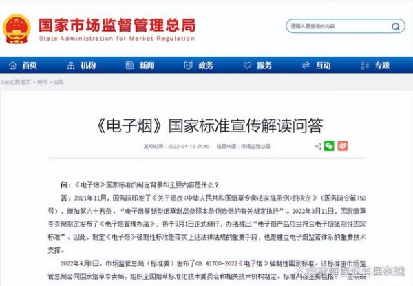 2022年4月8日,市場監管總局發布電子煙強制性國家標準。標準內容包括4個,即明確電子煙和霧化物相關術語和定義;要求電子煙設計以及原材料選用標準;對其煙具、霧化物以及釋放物提出確切的技術要求;嚴格規定電子煙產品標志和說明書。