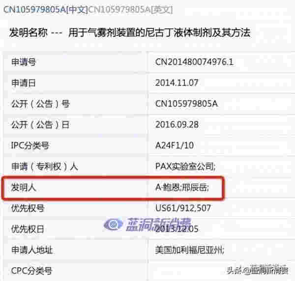 這其中又有一位中國人的名字會被提及,尼古丁鹽的聯合發明人,時任JUUL科學家的邢晨悅博士,現在是喜霧的首席科學家。