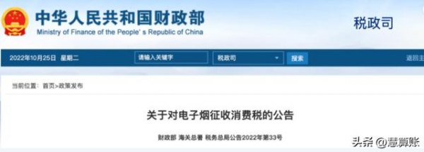 10月25日,財政部、海關總署、稅務總局發布了關于對電子煙征收消費稅的最新公告,明確了將電子煙納入消費稅征收范圍。