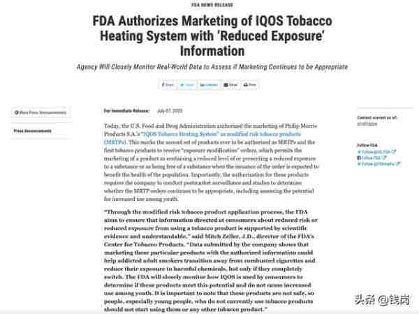 在歷時兩年及超 200 萬頁文件的嚴格評估后,2020年 4 月 30 日,美國食品和藥物管理局FDA 宣布,已授權菲利普莫里斯公司(PMI)在美國市場銷售新型煙草產品用于 IQOS“煙草加熱系統”,認為該產品“適合保護公眾健康”。檢測表明,加熱不燃燒卷煙煙氣有害成分含量較傳統卷煙降低了 90%。