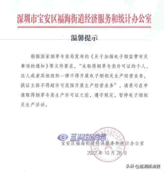 深圳寶安區福海街道經濟服務和統計辦公室也在10月28日向未獲證企業發送了暫停電子煙相關生產獲活動的「溫馨提示」。