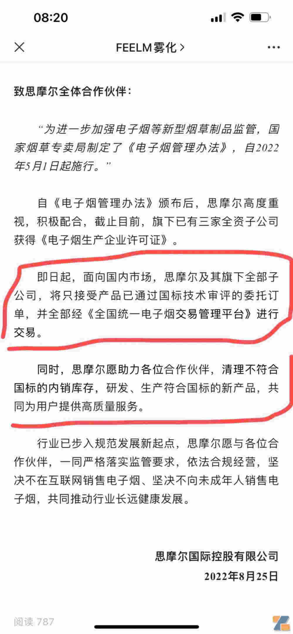 8月25日,國內電子煙供應鏈龍頭企業思摩爾發布公告,宣布國內市場即日起思摩爾及其旗下全部子公司,將只接受產品已通過國標技術審評的委托訂單,并全部經《全國統一電子煙交易管理平臺》進行交易。